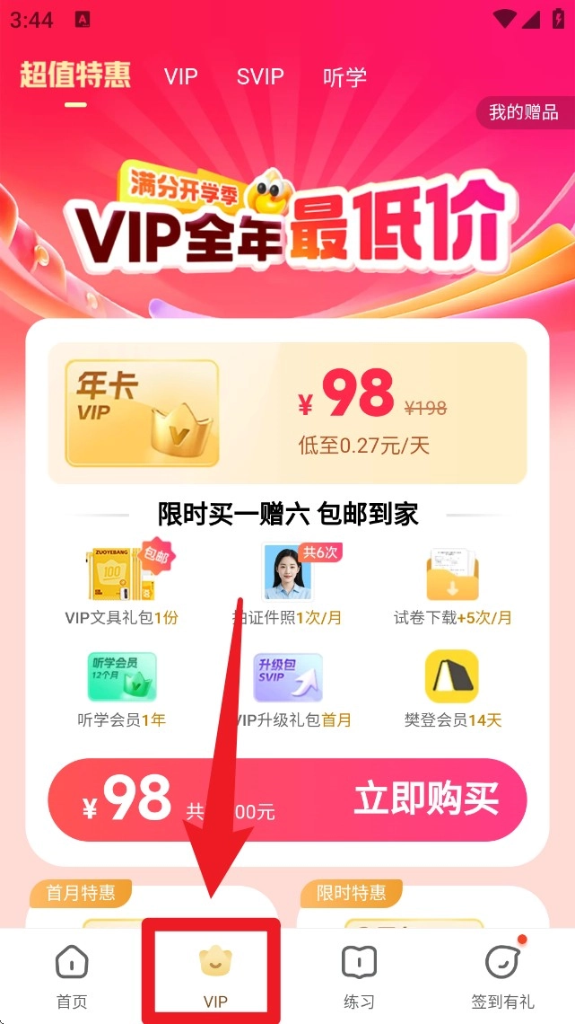 3.点击底部菜单栏中的VIP图标,进入会员专区页面查看优惠信息及会员权益详情。