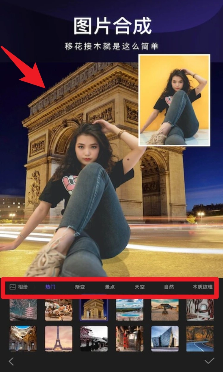1当你选择图片合成功能后,可在底部的素材分类里挑选背景模板,接着点击导入人物照片,人物照片便会自动融合到新场景之中。