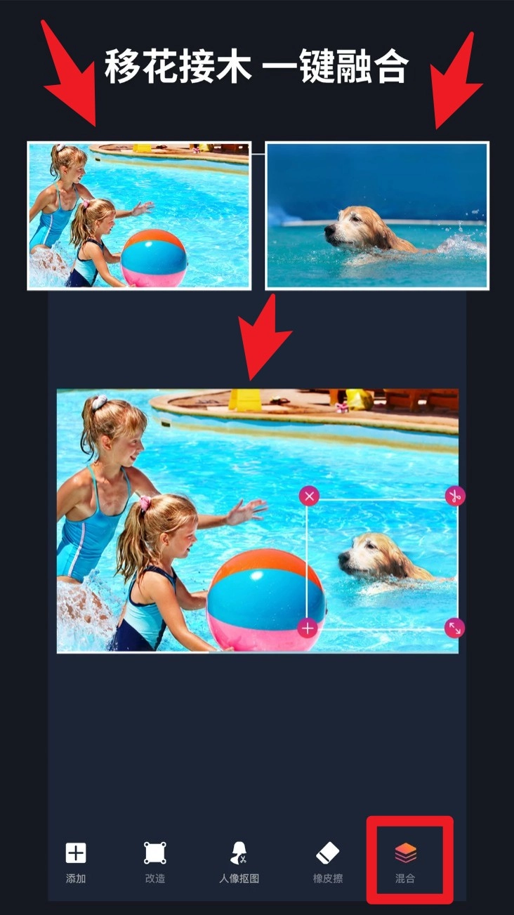 3. 使用融合工具将两张图像进行组合,可手动缩放、旋转并对齐位置,点击混合实现一键融合。