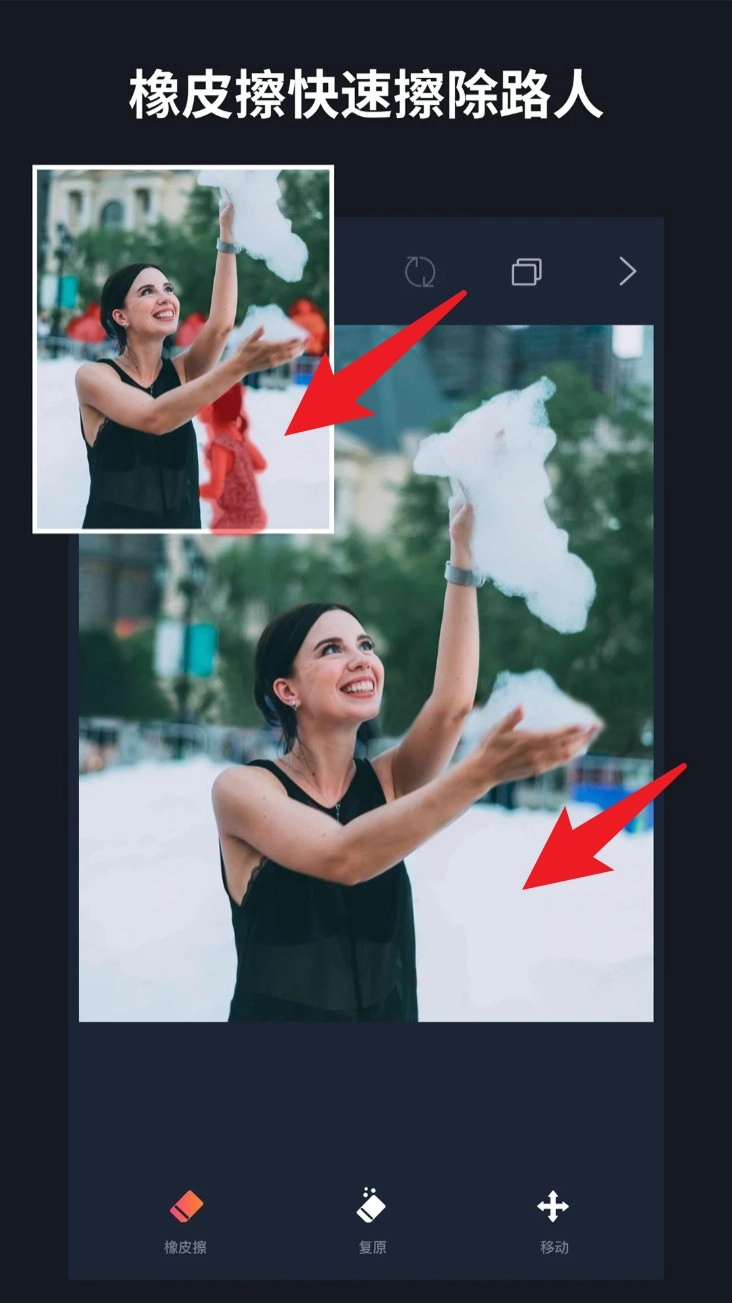 4. 打开橡皮擦功能后,拖动手指擦除不需要的区域,如多余背景或路人,画面将自动完成修复补全。