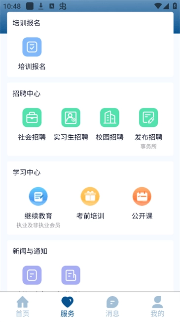 2.【服务】提供了培训报名、招聘中心、学习中心、新闻与通知