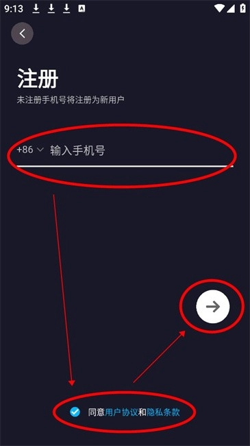 4.输入手机号并勾选下方的同意协议后点击右边的箭头