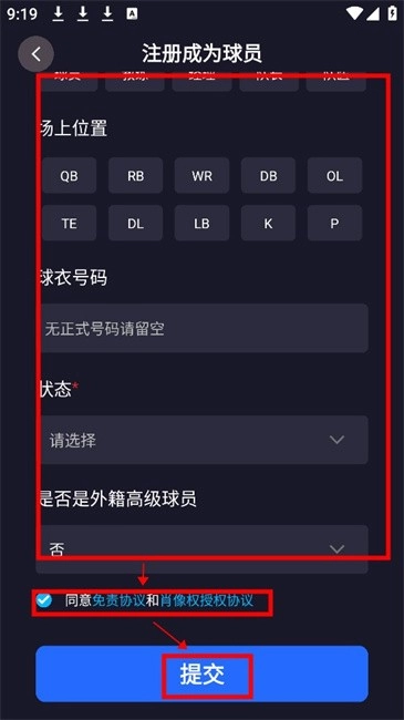 9.按照要求填写注册信息后同意协议点击【提交】即可完成球员注册