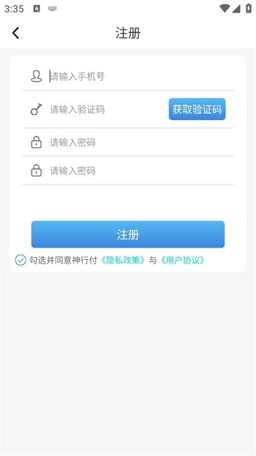 2.依次输入手机号,填写获取的验证码和密码并勾选协议后点击“注册”